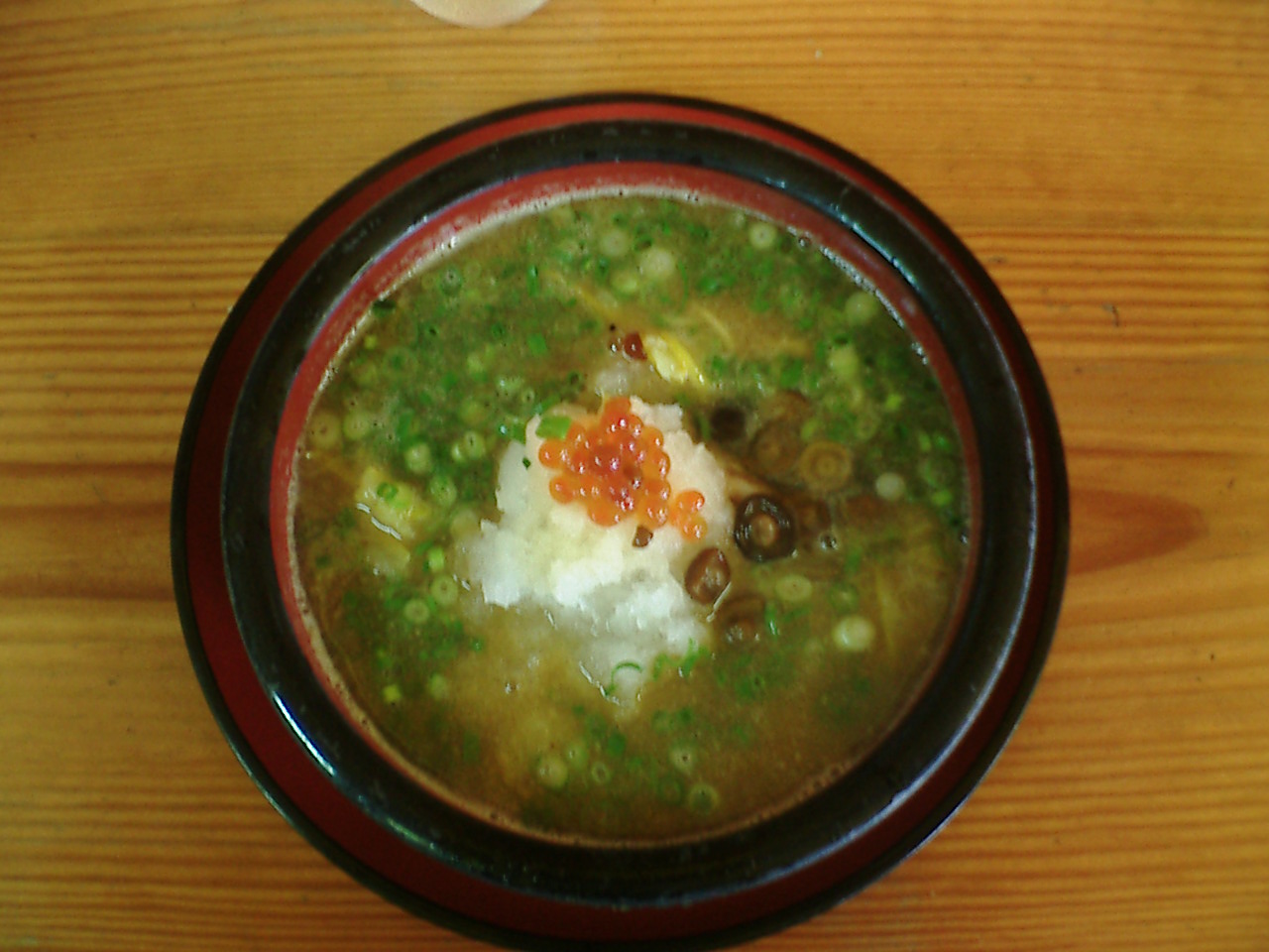 果たして出てきたのは、油の浮いたスープに、どでんと自己主張するみぞれ=だいこんおろし。そしてその上に乗るいくら。なめ茸、レモンの切り身、ネギ。